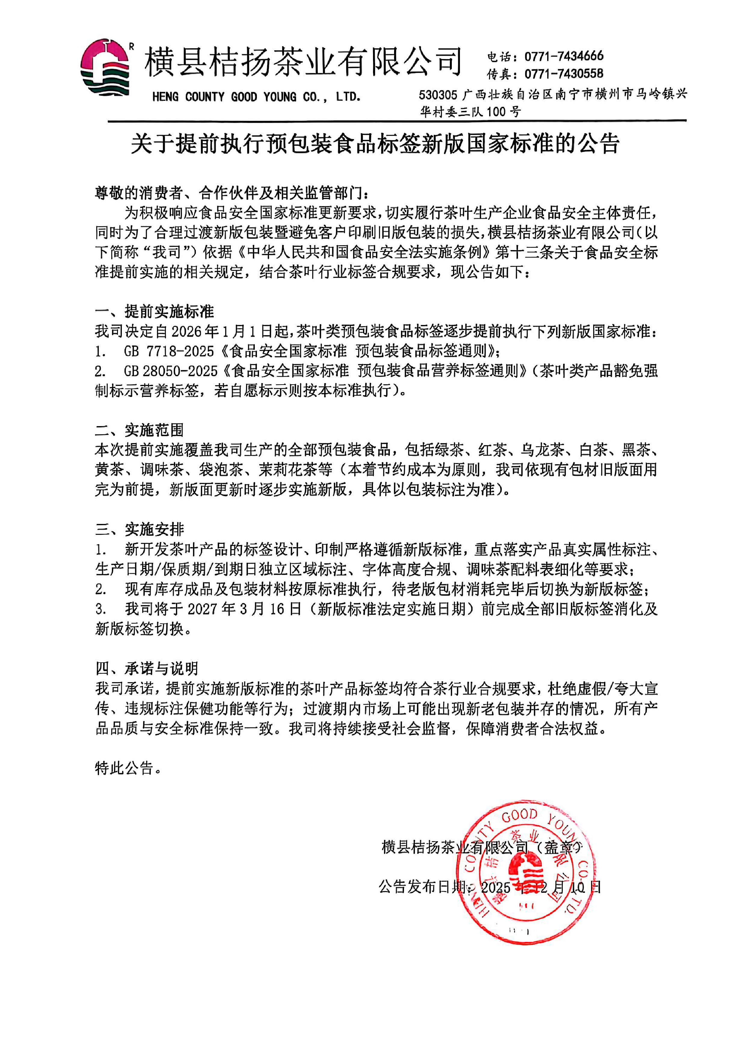 关于提前执行预包装食品标签新版因家标准的公告